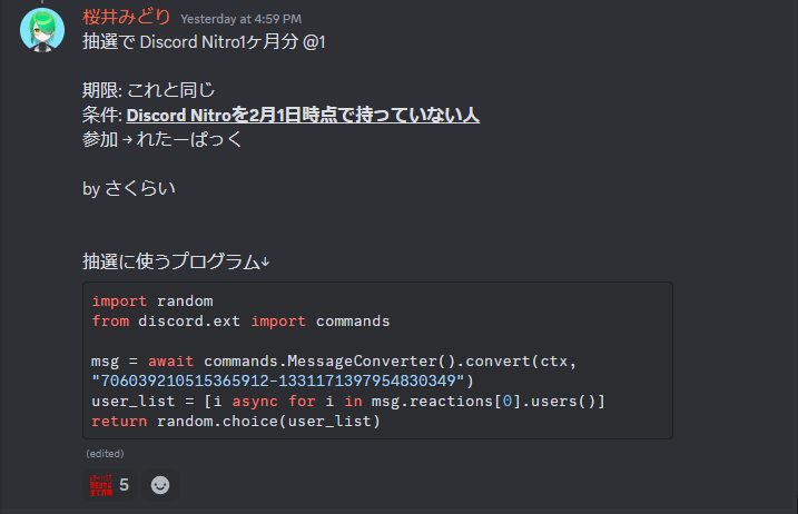 当選者には、DiscordのDMでご連絡します。 (桜井みどり からDMを受け取れるようにしておいてください)