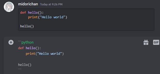 送信するテキストをバッククォート1つ、または3つで囲むとコードブロックになります。
